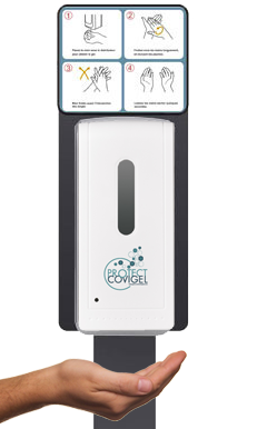 Grâce au distributeur automatique de gel hydroalcoolique sans contact Protect Covigel, vous pourrez vous désinfecter les mains au passage des mains sous la cellule du distributeur de liquide.
